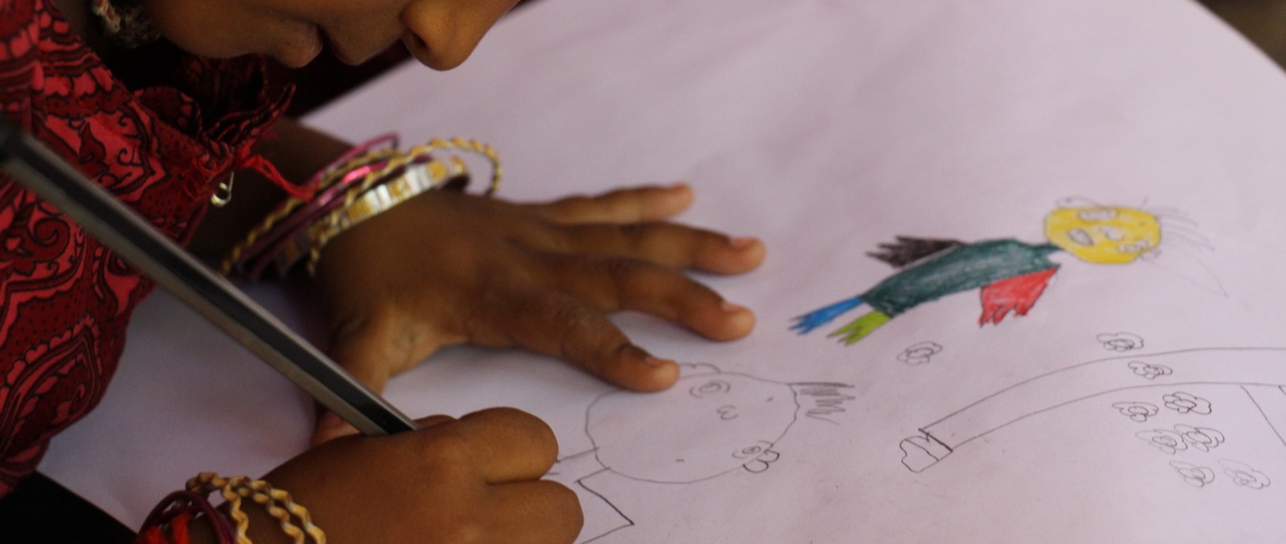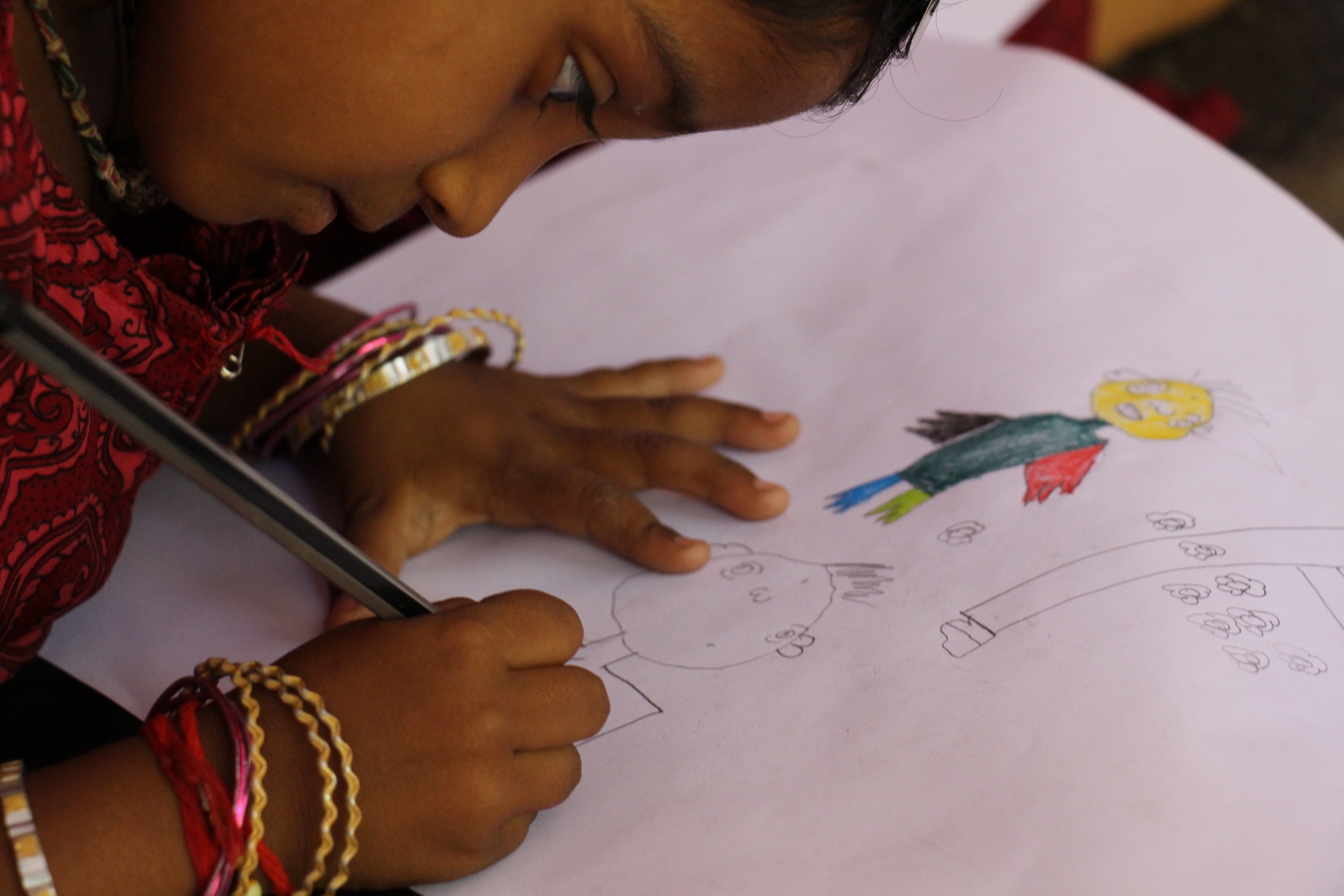 Niña disfrutando, desarrollando la imaginación y la creatividad, dibujando (en el Center for Speech & Hearing Impaired Children de Bukkaraya Samudram, en Anantapur, India). Fotografía de Carlos Escaño, cc by-nc